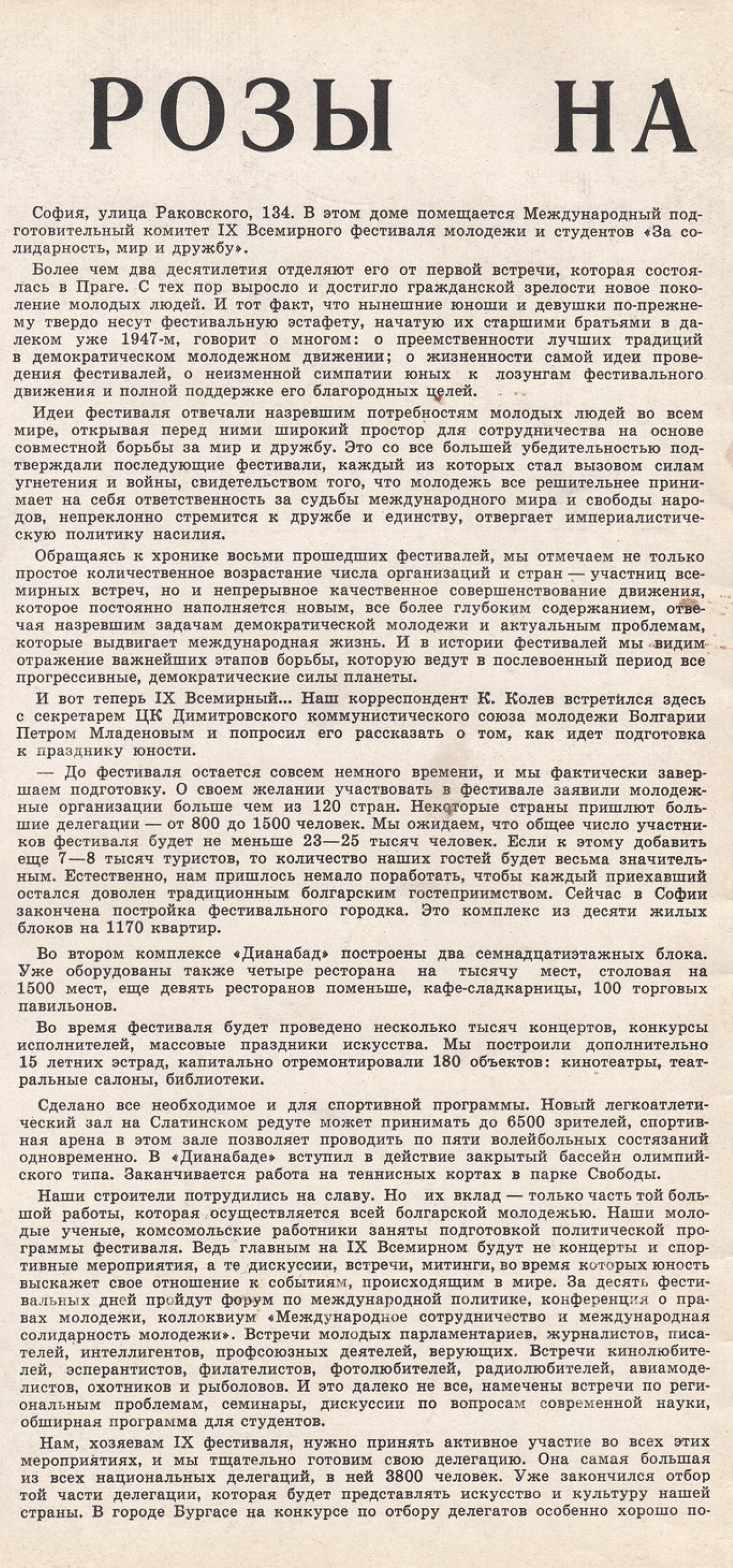 Эта редакционная статья рассказывала о подготовке в Болгарии к IX-му Всемирному фестивалю молодёжи и студентов, который проходил с 28 июля по 6 августа 1968 года в Софии. В предпоследнем абзаце статьи упоминается ансамбль "Битлз", а также – "Роллинг стоунз" ("The Rolling Stones") и "Трефик" ("Traffic"). Известно, что битлы так и не приезжали на фестиваль.