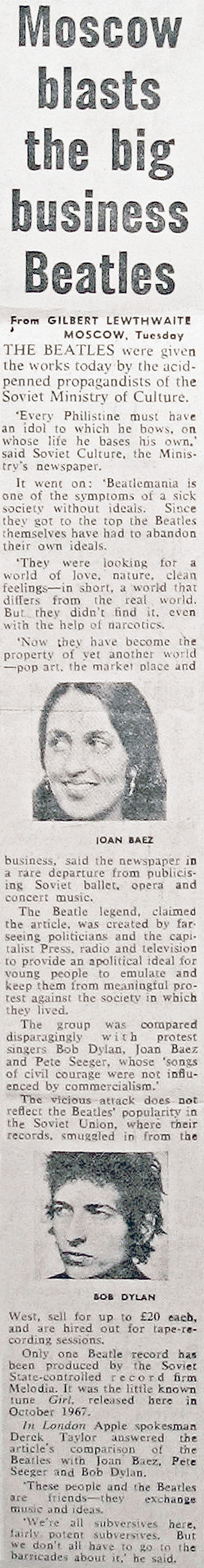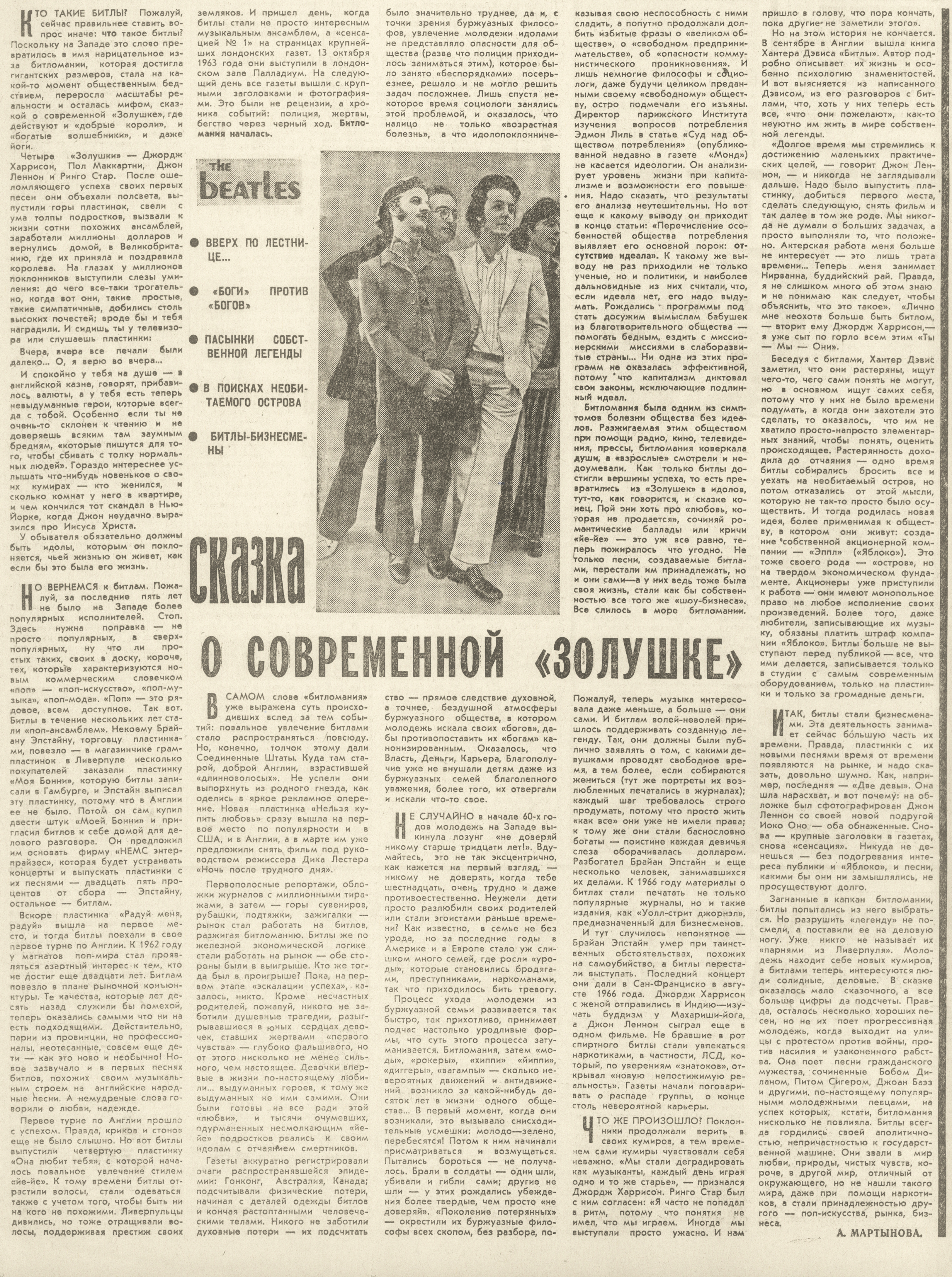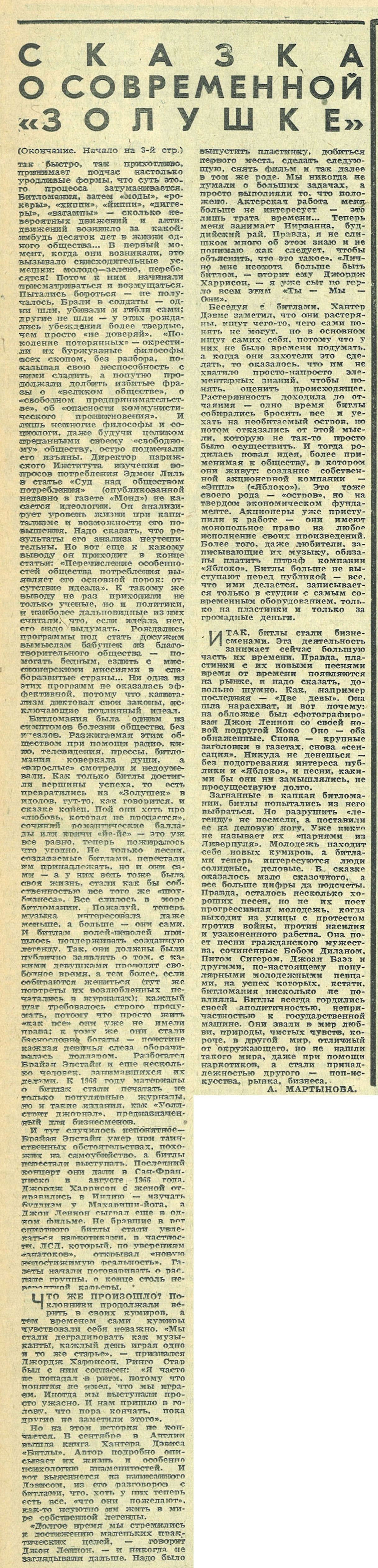 Советский критик утверждает, что Битлы МОСКВА, 3 декабря – Газета Министерства культуры пролила сегодня крокодиловы слёзы по Битлам, чья музыка никогда не пользовалась благосклонностью высоких советских чиновников от культуры. (Перевод с английского – Андрей Луканин, |