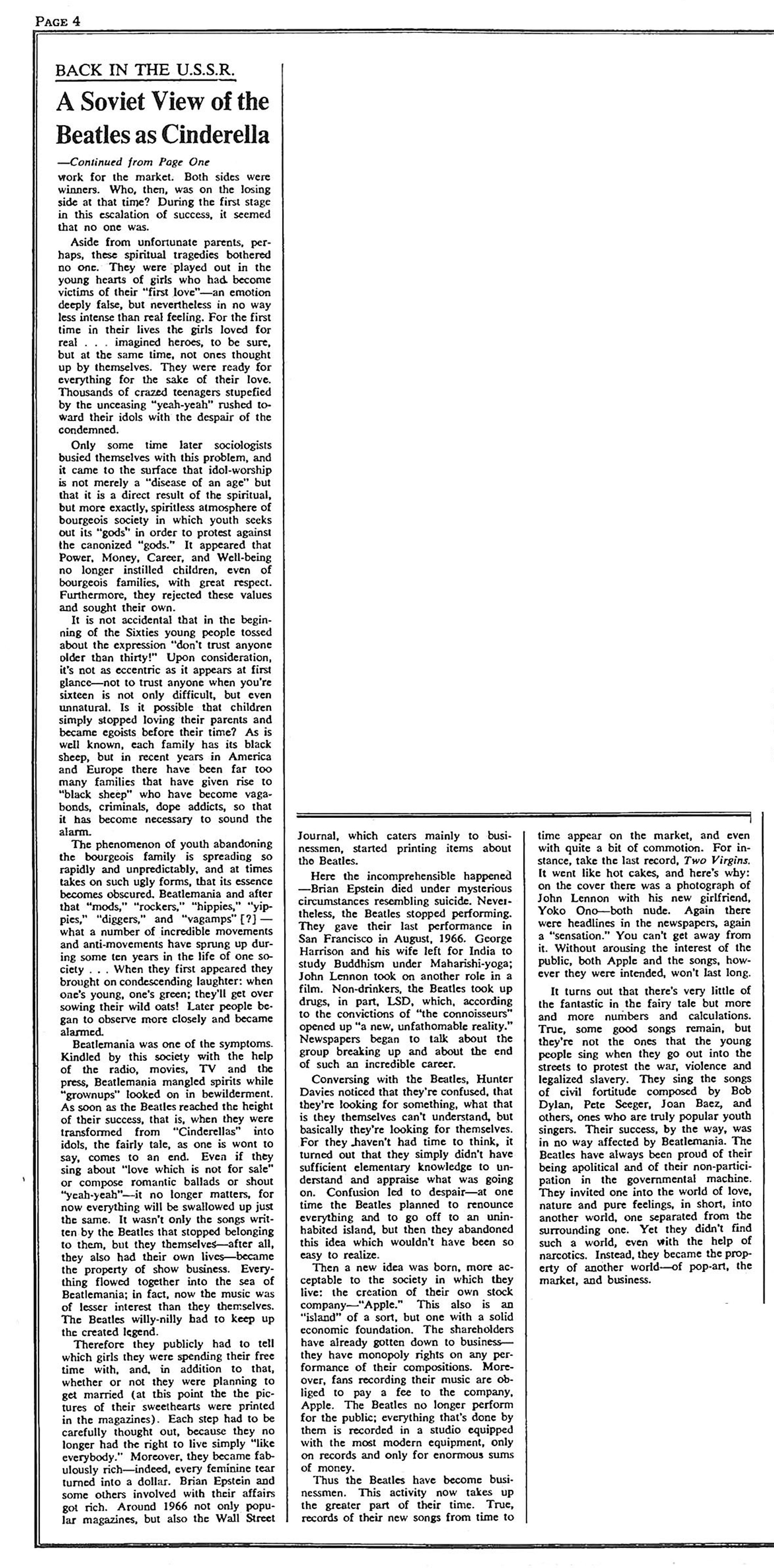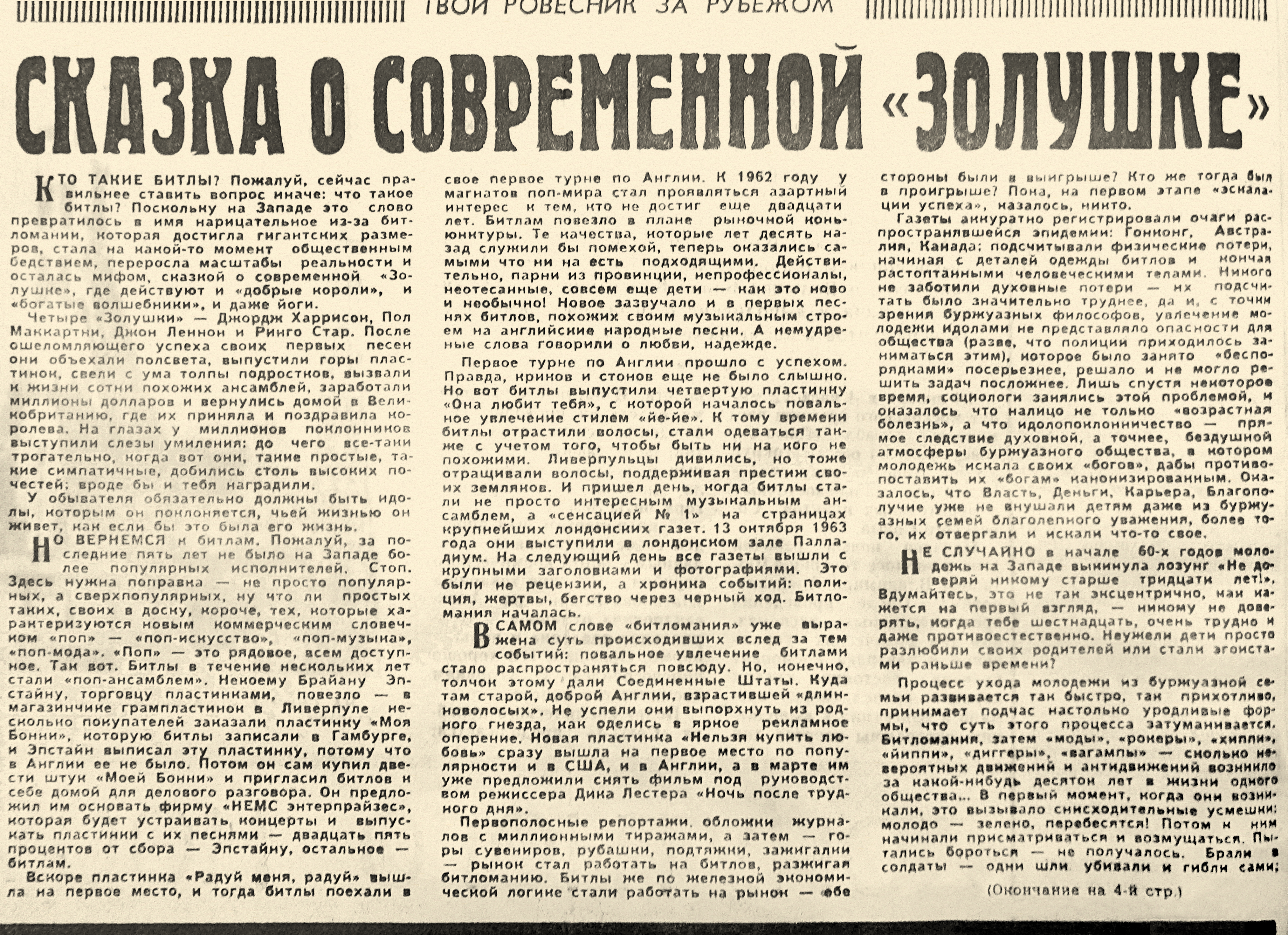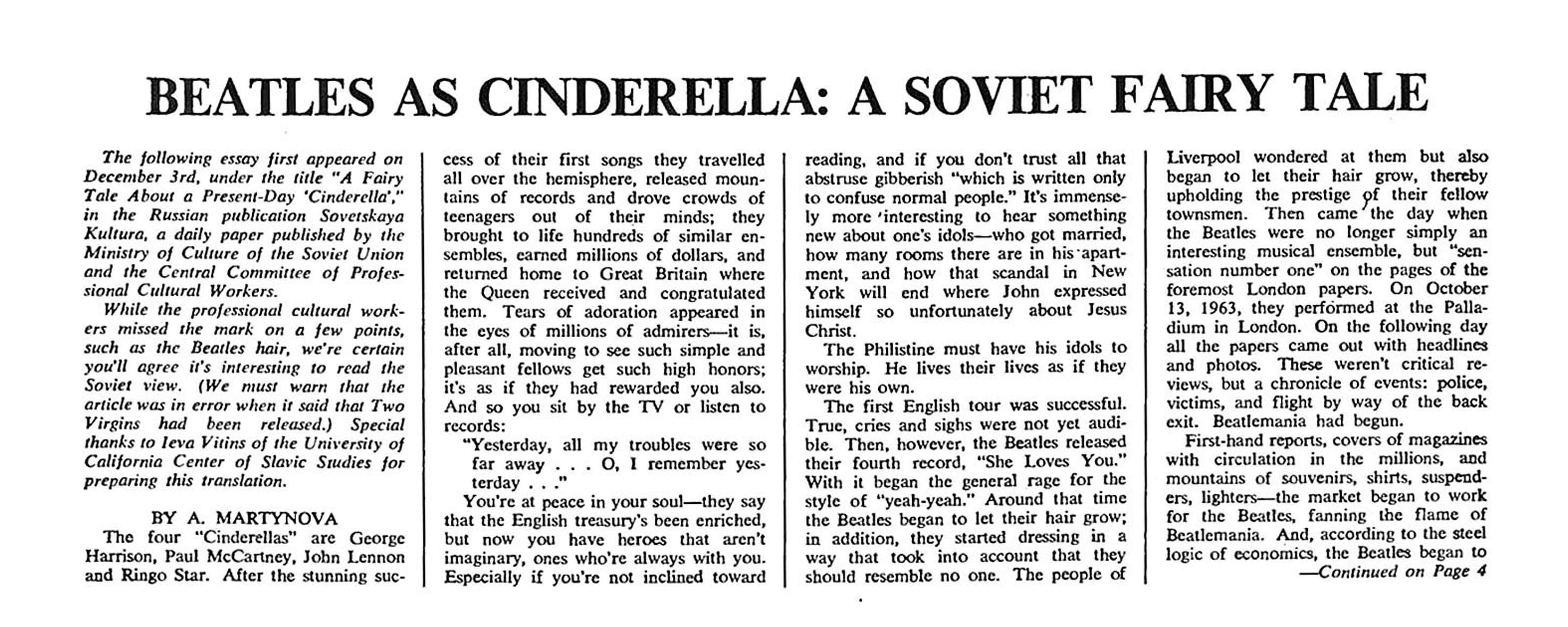 А 15 февраля 1969 года американский журнал Rolling Stone напечатал полный перевод советской статьи, сделав небольшое предисловие. Статья начиналась на странице 1 – BEATLES AS CINDIRELLA: A SOVIET FAIRY TALE ("БИТЛЗ" КАК ЗОЛУШКА: СОВЕТСКАЯ СКАЗКА), её окончание было на странице 4 и имело заголовок A Soviet View of the Beatles as Cinderella (Советский взгляд на "Битлз" как на Золушку) [см. ниже оригинал статьи].