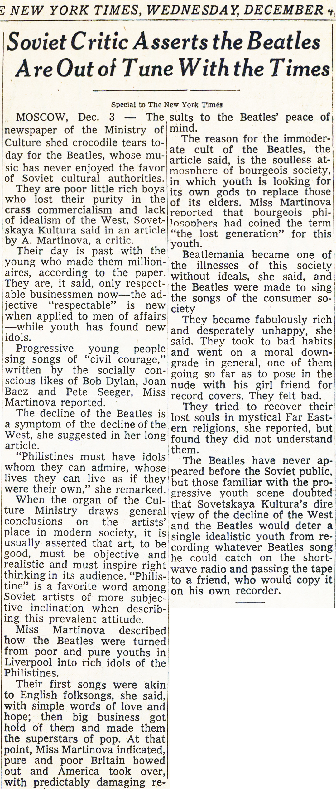 Как уже сказано выше, первоначально данная статья была напечатана в газете Советская культура 3 декабря 1968 года. А уже на следующий день, 4 декабря, в американской газете The New York Times (на странице 10) появилась рецензия на неё – под названием Soviet Critic Asserts the Beatles Are Out of Tune With the Times [см. ниже оригинал статьи и её перевод].