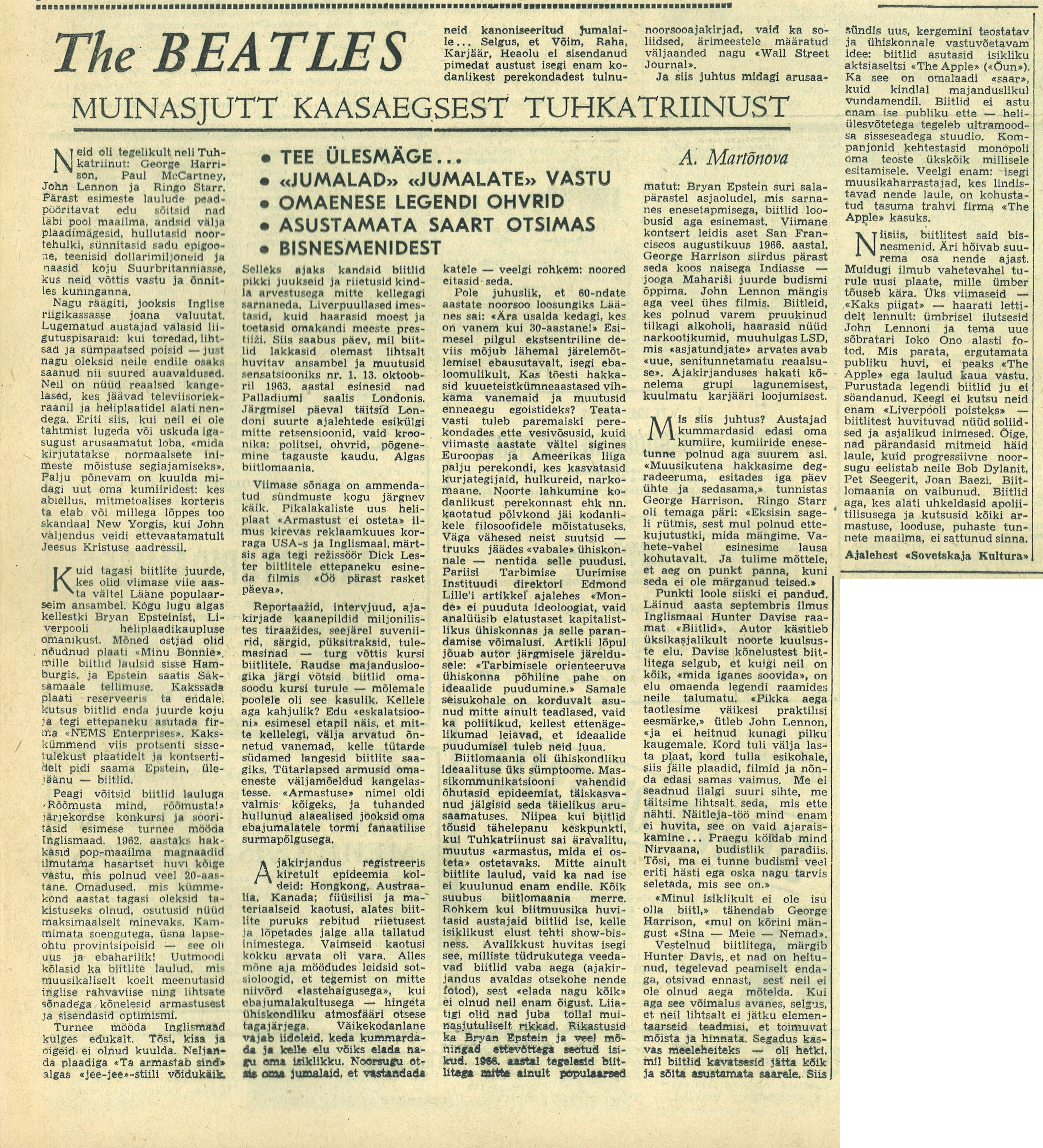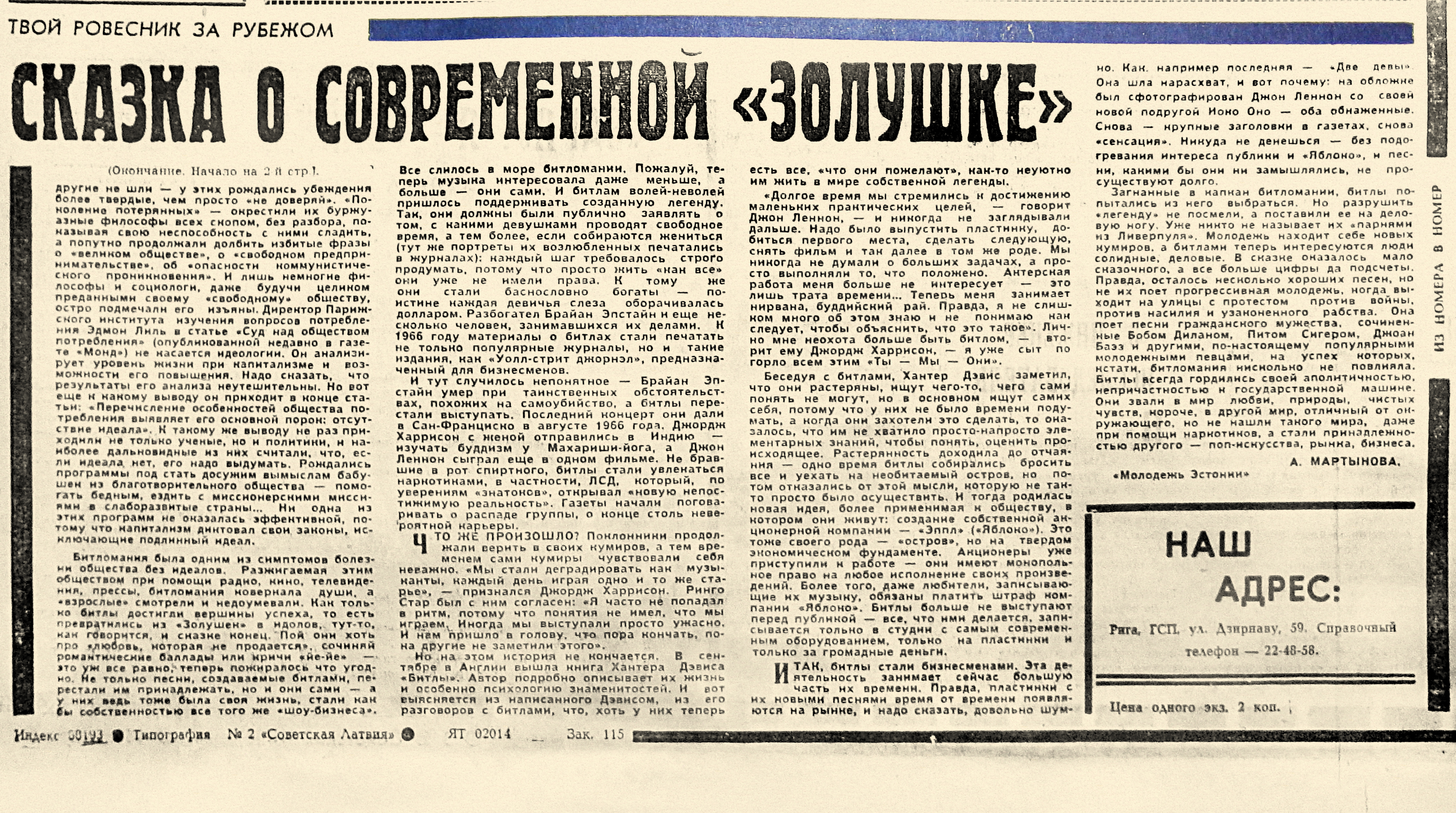 В эстонской эстоноязычной газете Ноорте хяэль статья имеет название The BEATLES. MUINASJUTT KAASAEGSEST TUHKATRIINUST (The BEATLES. СКАЗКА О СОВРЕМЕННОЙ ЗОЛУШКЕ). Автор также указан по-эстонски – A. Martõnova.