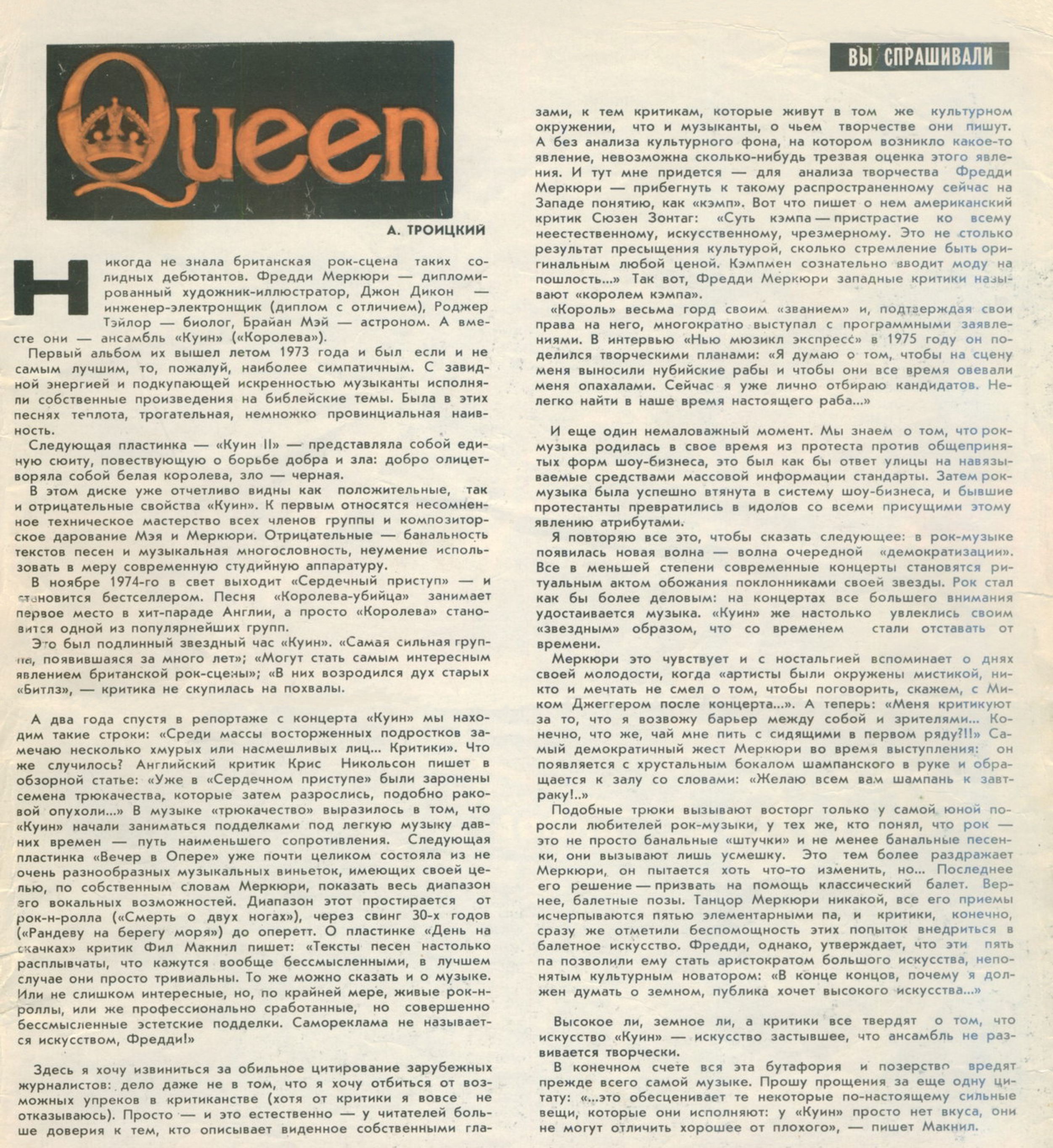 Эта статья, опубликованная в рубрике "ВЫ СПРАШИВАЛИ", рассказывает о группе "Куин", но в ней упоминается ансамбль "Битлз" (первая колонка, шестой абзац сверху).
