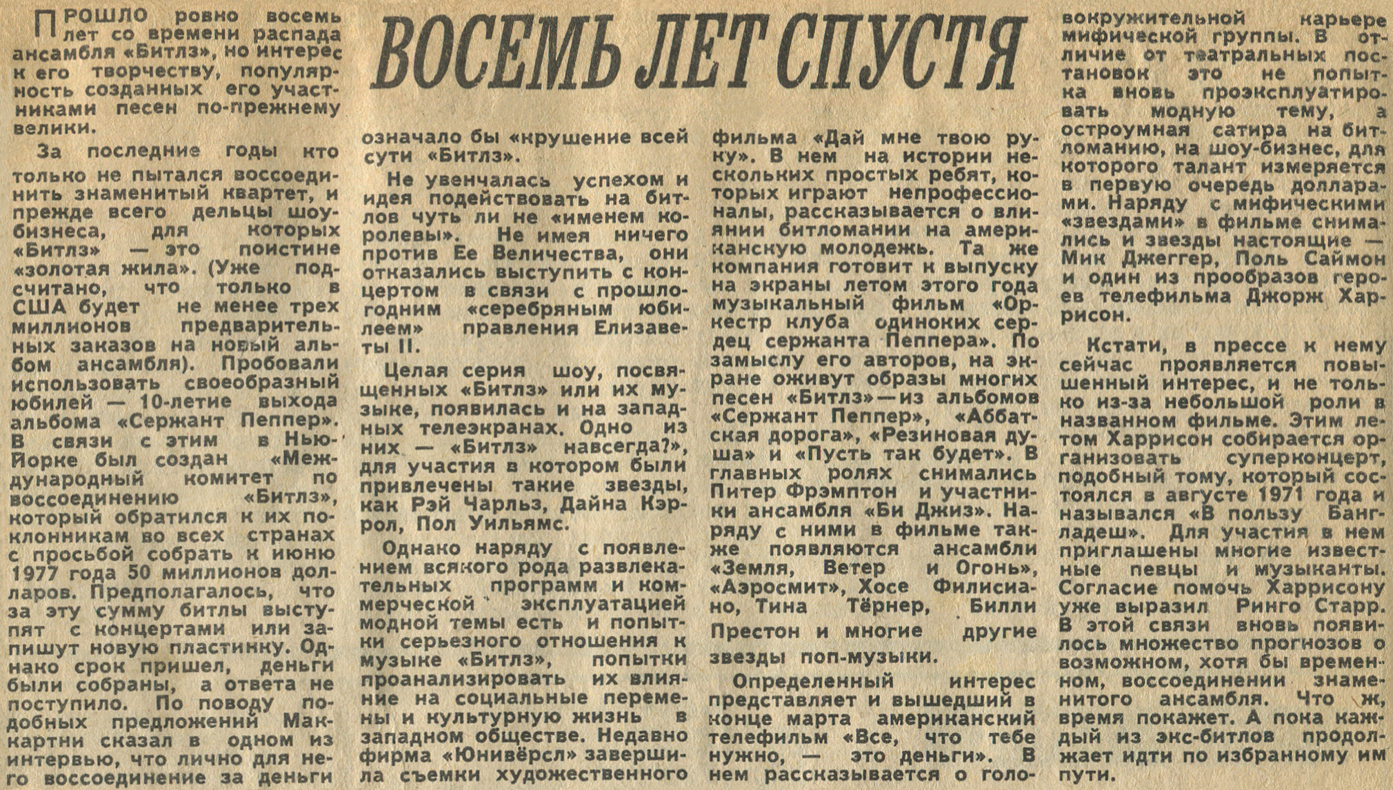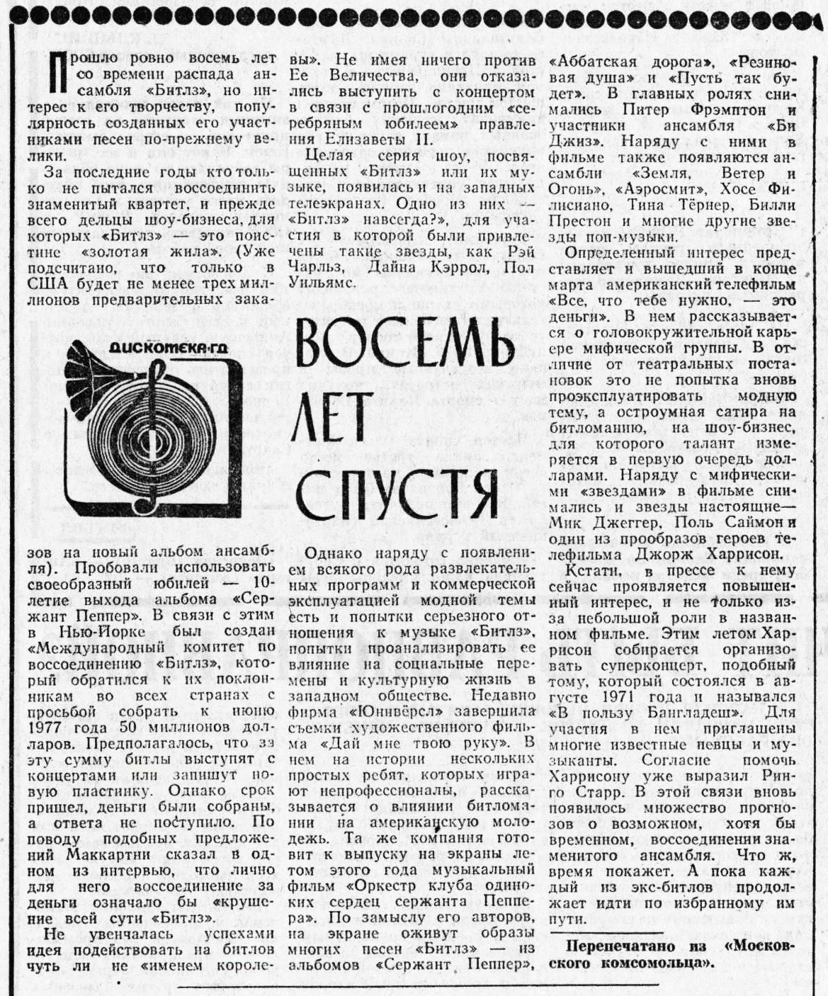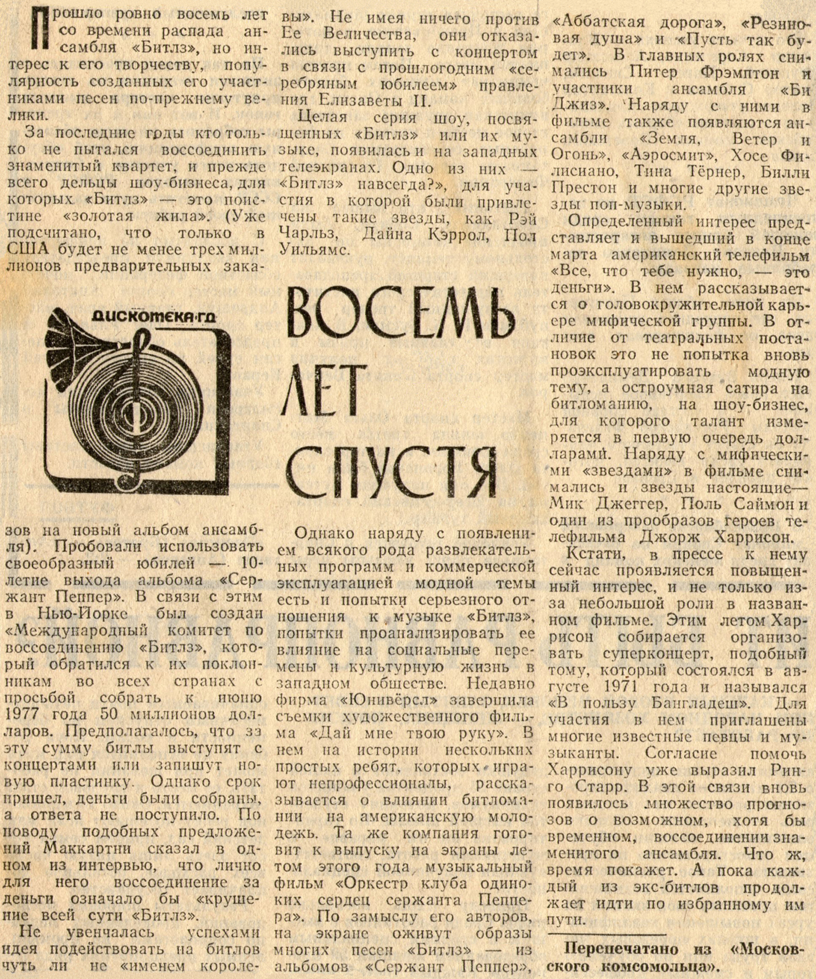 Оригинал статьи был напечатан в выпуске № 34 рубрики "ЗВУКОВАЯ ДОРОЖКА" газеты Московский комсомолец. В этой статье имя Харрисона указано как Джорж (вместо Джордж).