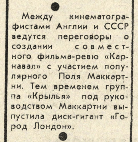 Эта короткая заметка была опубликована в разделе (подрубрике) "На всех широтах" в выпуске № 19 музыкальной рубрики "КЛУБ РИТМ". Из неё можно узнать, что, оказывается, в 1978 году между кинематографистами Англии и СССР велись переговоры о создании совместного фильма-ревю "Карнавал" с участием Пола Маккартни. В публикации музыкант указан под именем Поль.