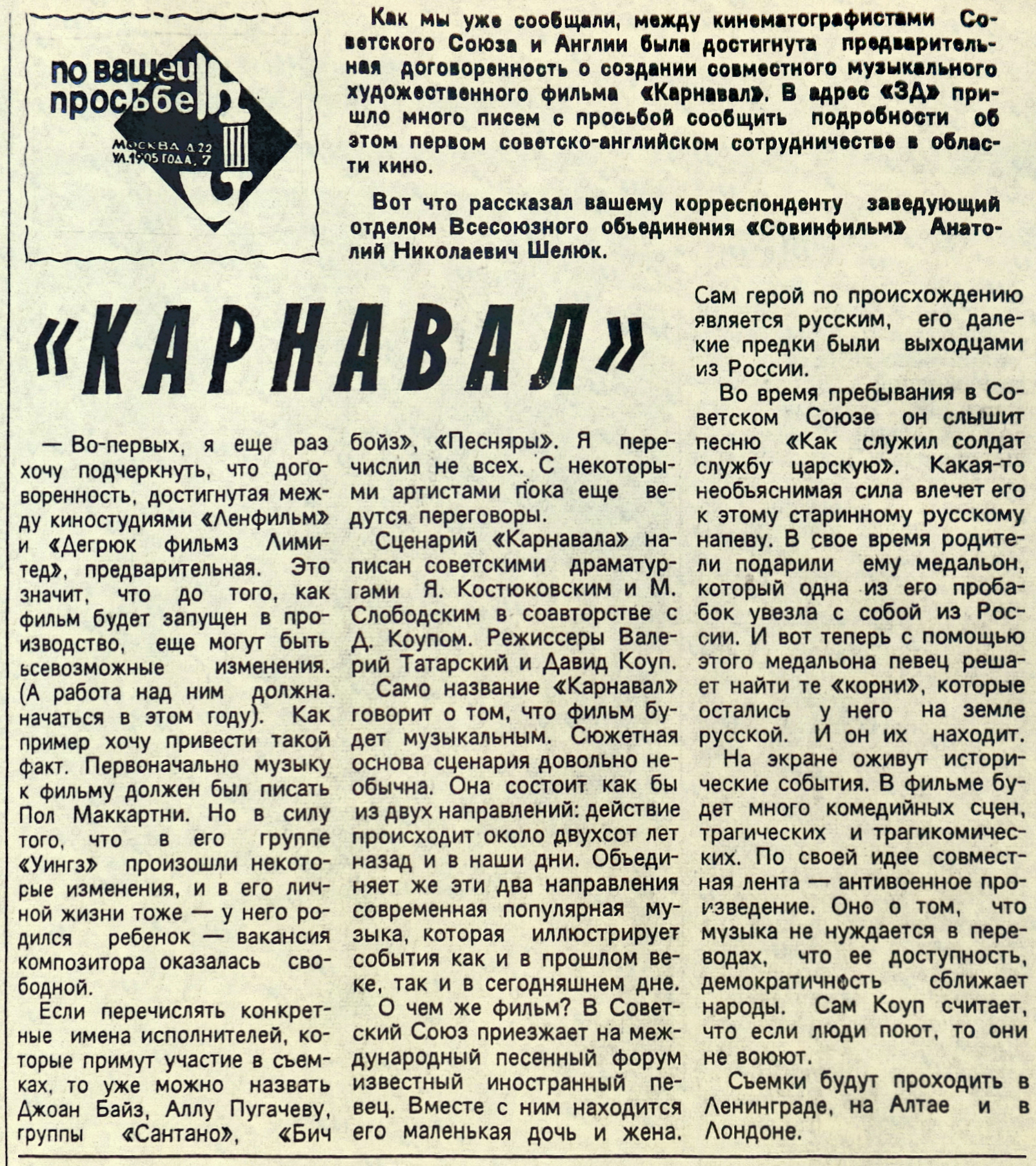 Эта статья была напечатана в выпуске № 35 рубрики "ЗВУКОВАЯ ДОРОЖКА" в подрубрике "ПО ВАШЕЙ ПРОСЬБЕ".