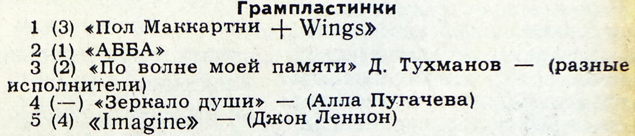 Эта статья была напечатана в выпуске № 36 рубрики "ЗВУКОВАЯ ДОРОЖКА", и в ней были представлены результаты музыкального парада за май 1978 года. В этом месячном хит-параде представлены две позиции по битловской теме в категории ГРАМПЛАСТИНКИ: