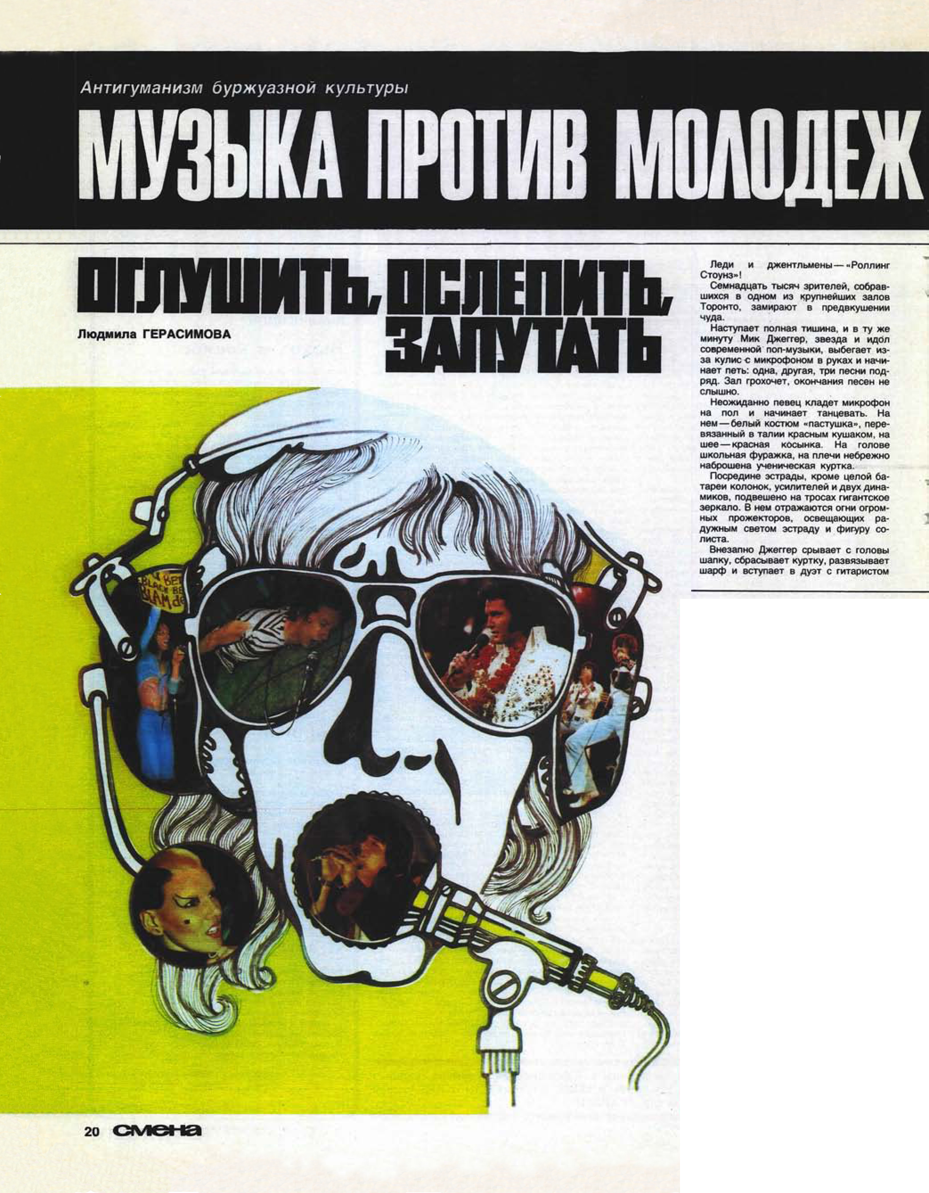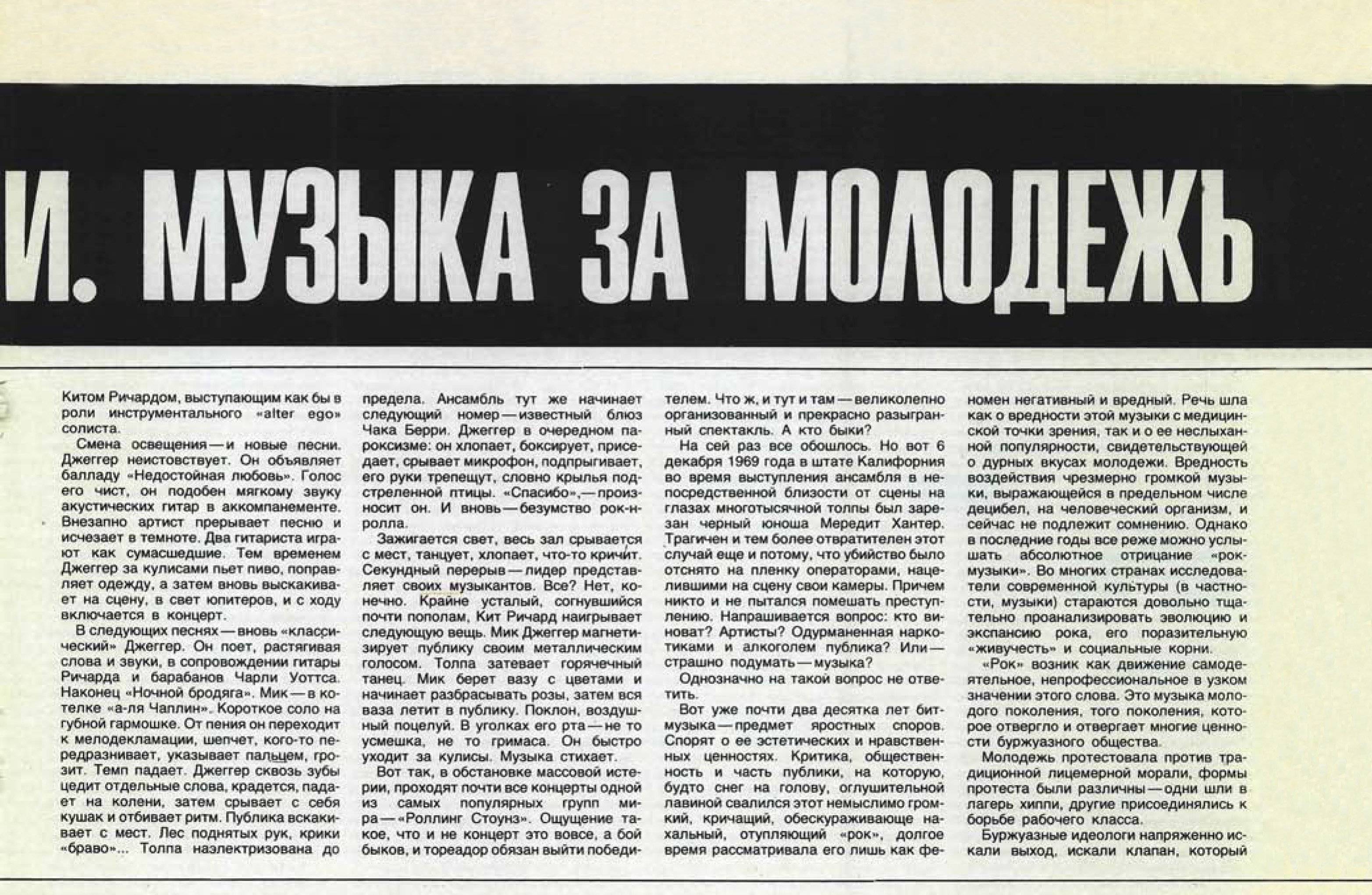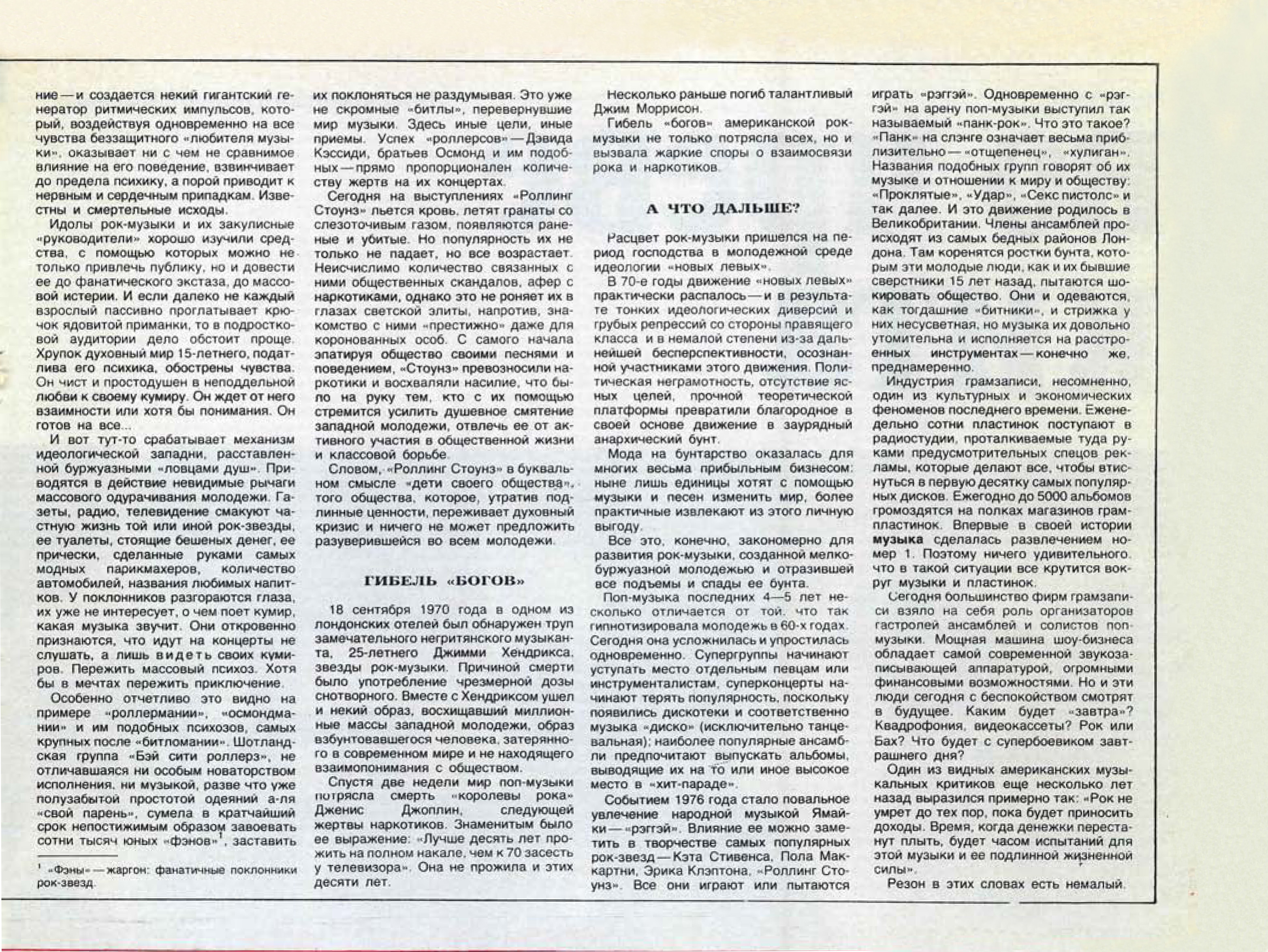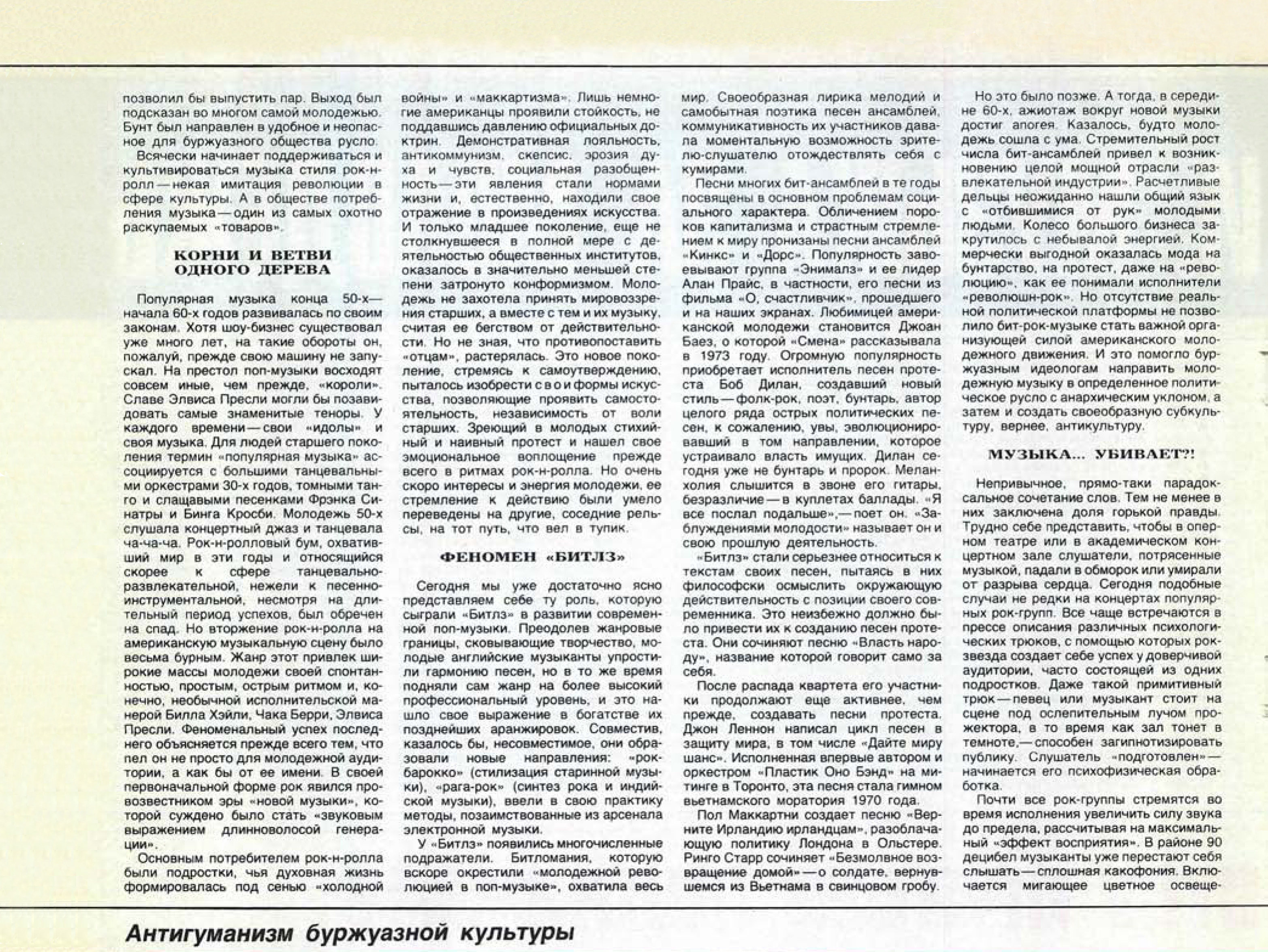 Эта статья, напечатанная под рубрикой "Антигуманизм буржуазной культуры. МУЗЫКА ПРОТИВ МОЛОДЁЖИ. МУЗЫКА ЗА МОЛОДЁЖЬ", рассказывает о западной рок-музыке. Один из разделов публикации называется ФЕНОМЕН «БИТЛЗ» (страница 22). Также в разделе А ЧТО ДАЛЬШЕ? отдельно упоминается Пол Маккартни (страница 23, третья колонка, первый абзац снизу).