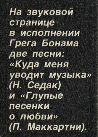 В самой статье о Поле Маккартни не упоминается. Но данная статья сопровождается звуковой страницей 11 (которой является сторона 1 гибкой пластинки 6), где представлены песни в исполнении Г. Бонама. Из краткой аннотации к звуковым дорожкам, которая размещена в левом верхнем углу (бумажной) страницы 9, можно узнать, что одна из песен называется Глупые песенки о любви (Silly Love Songs) – она была написана П. Маккартни. Также эта песня указана на странице 16 в перечне звуковых страниц, где можно ознакомиться с содержанием каждой из гибких пластинок.