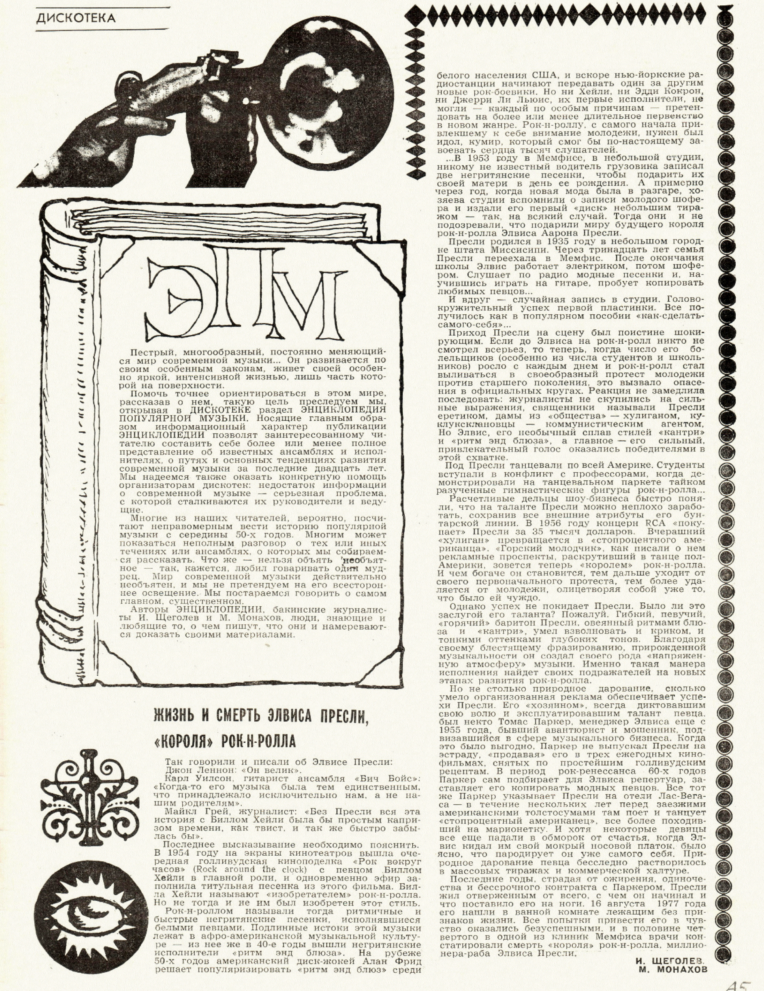 Эта статья, опубликованная в рубрике "ДИСКОТЕКА", в разделе "ЭПМ", что расшифровывается как "ЭНЦИКЛОПЕДИЯ ПОПУЛЯРНОЙ МУЗЫКИ", рассказывает об Элвисе Пресли, но в ней приведена цитата из высказываний Джона Леннона (две первые строки статьи).